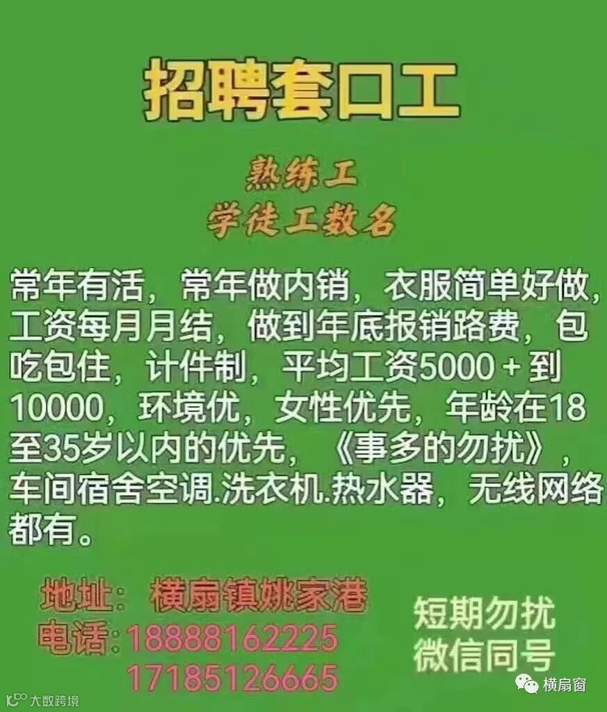 ⭕【招套囗工】招熟练套口工15名.男女不限.学徒工也可以.包吃包住.地址在横扇镇金门湾旁📱15862582547 / 17306152860