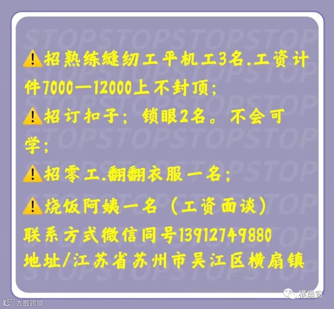 ⚠️诚招套口熟练工5名(临时也行)工作地方干净清爽.住宿条件好.卫生间.洗澡间干净.无线网全楼层覆盖.工价透明合理.月薪8000----20000上不封顶,每天下班开单子,长年有活;联系电话15518337091 / 18506192025微信同号,地址:横扇镇上