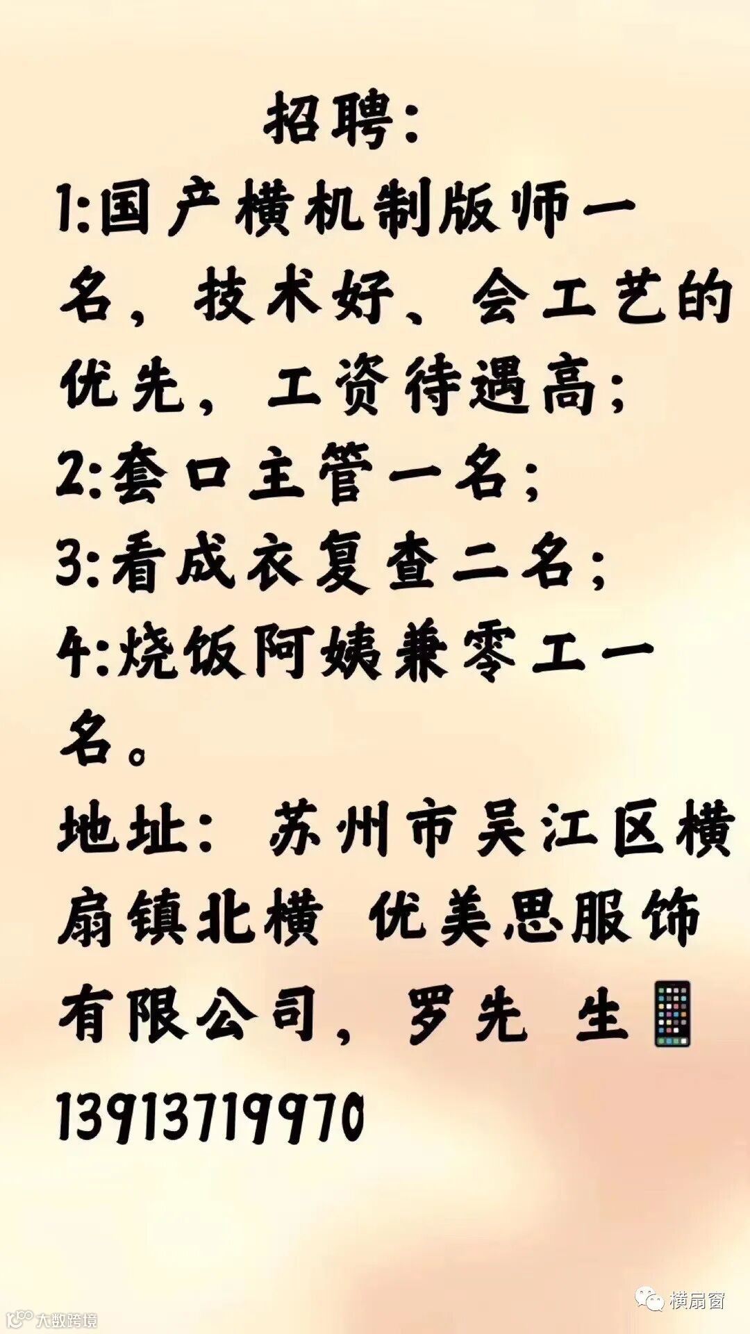 2:套口主管一名;3:看成衣复查二名;4:烧饭阿姨兼零工一名。地址:苏州市吴江区横扇镇北横 优美思服饰有限公司,罗先 生📱13913719970