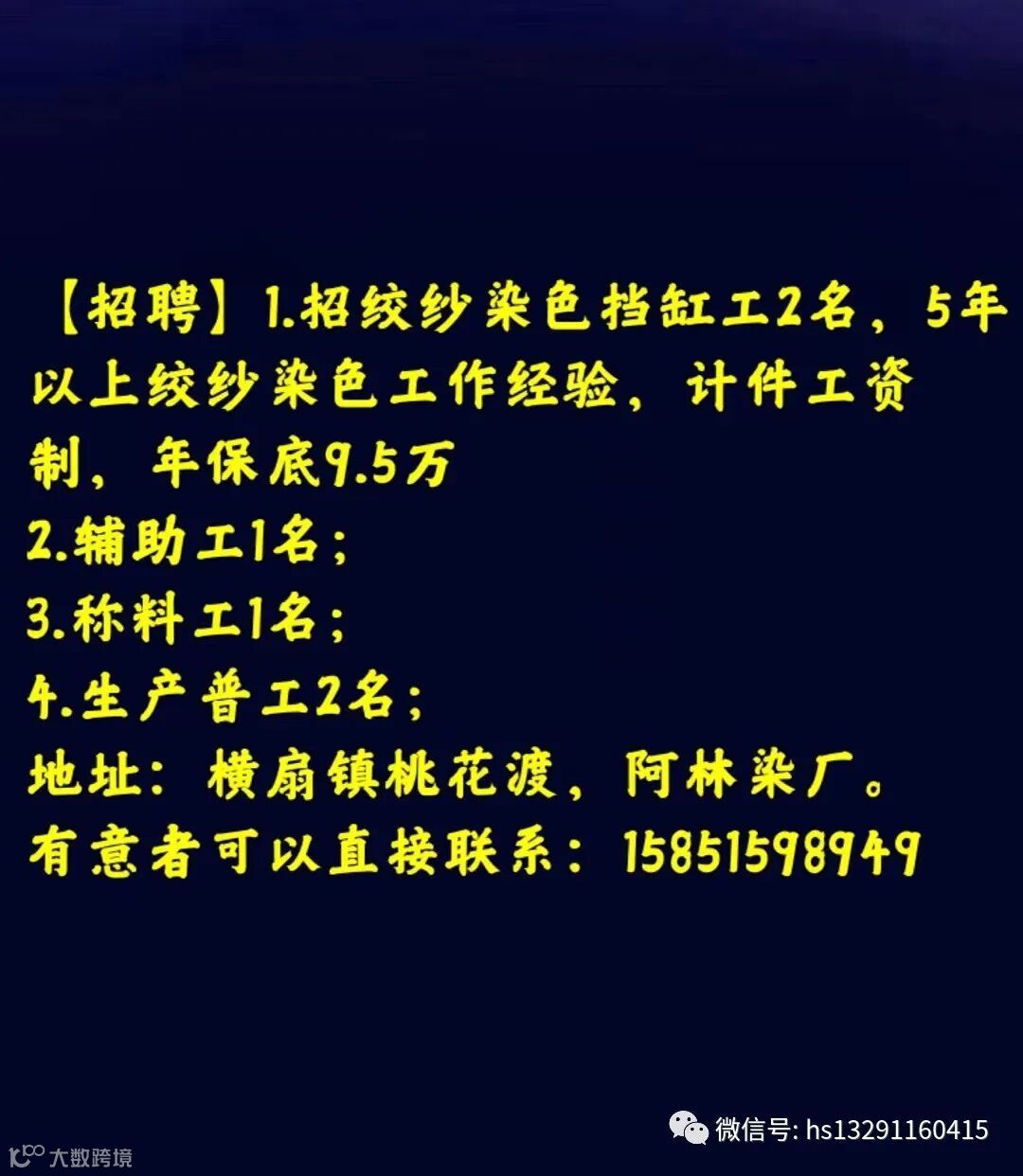 【招聘】1.招绞纱染色挡缸工2名,5年以上绞纱染色工作经验,计件工资制,年保底9.5万