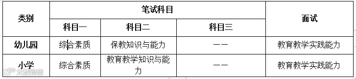 注2:幼儿园面试不分科目,小学面试科目分语文、英语、社会、数学、科学、音乐、体育、美术、心理健康教育、信息技术、小学全科。