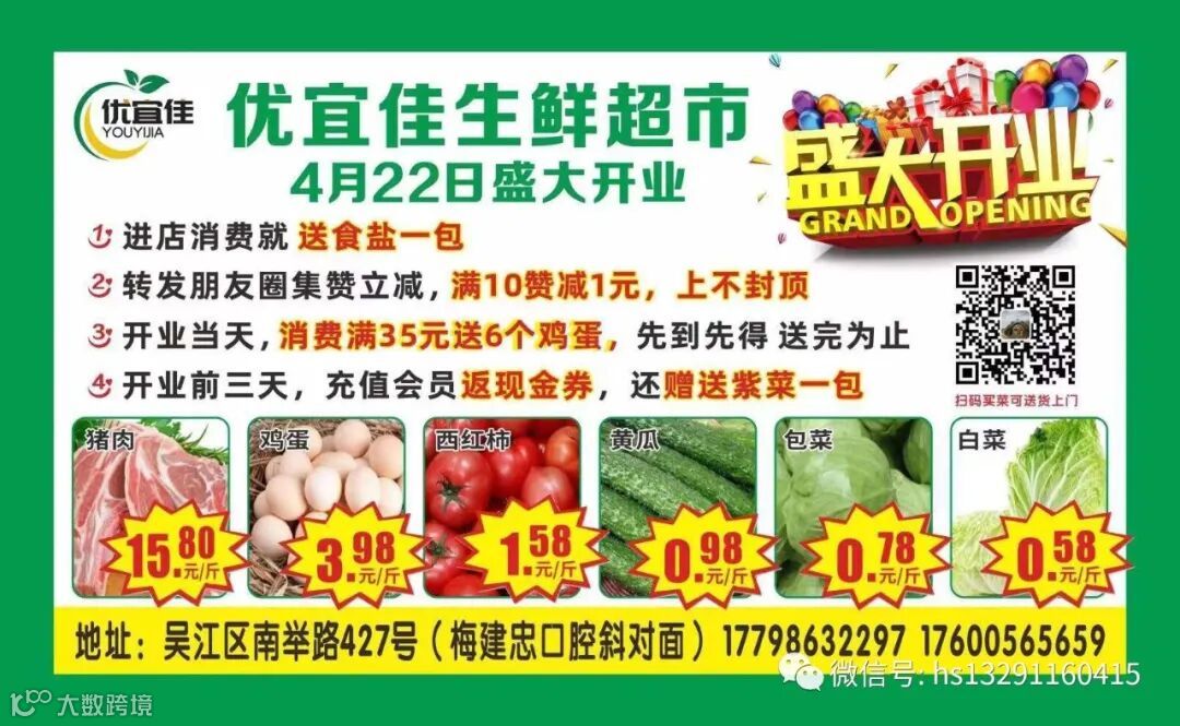 📣热烈祝贺:4月22“优宜佳”生鲜超市开业,猪肉15.8/斤,鸡蛋4块/斤,西红柿1.58/斤,黄瓜0.98/斤,包菜8毛不到,白菜更是7毛不到,更多物美价廉的生鲜尽在“优宜佳生鲜超市”,优宜佳生鲜超市您的不二之选,地址:吴江区南举路427号(梅建忠口腔斜对面)