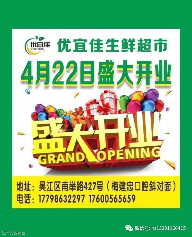 📣热烈祝贺:4月22“优宜佳”生鲜超市开业,猪肉15.8/斤,鸡蛋4块/斤,西红柿1.58/斤,黄瓜0.98/斤,包菜8毛不到,白菜更是7毛不到,更多物美价廉的生鲜尽在“优宜佳生鲜超市”,优宜佳生鲜超市您的不二之选,地址:吴江区南举路427号(梅建忠口腔斜对面)