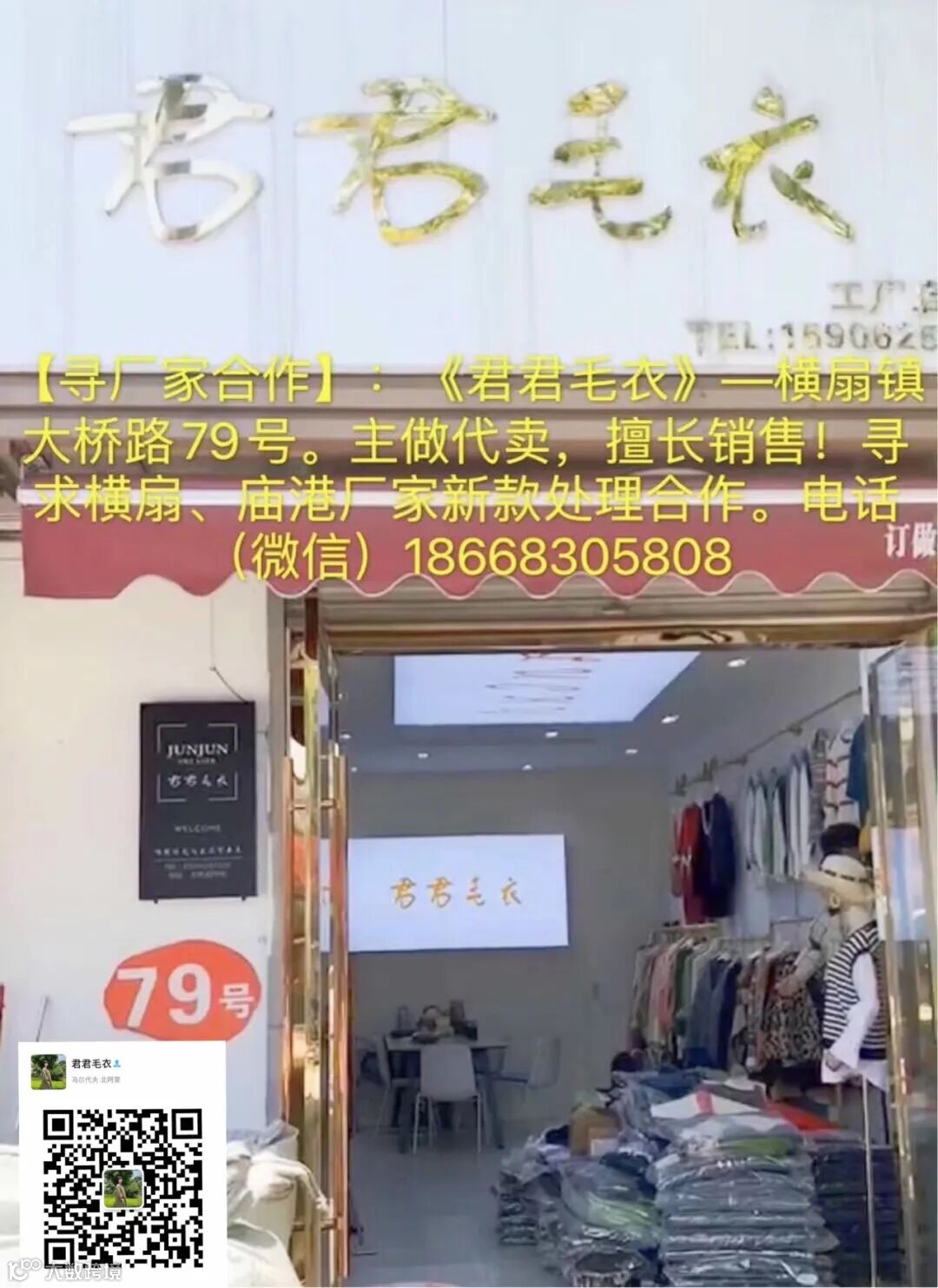“君君毛衣工厂店”横扇镇大桥路79号!主做代卖,擅长销售!寻求横扇、庙港厂家新款处理合作!电话/微信18668305808