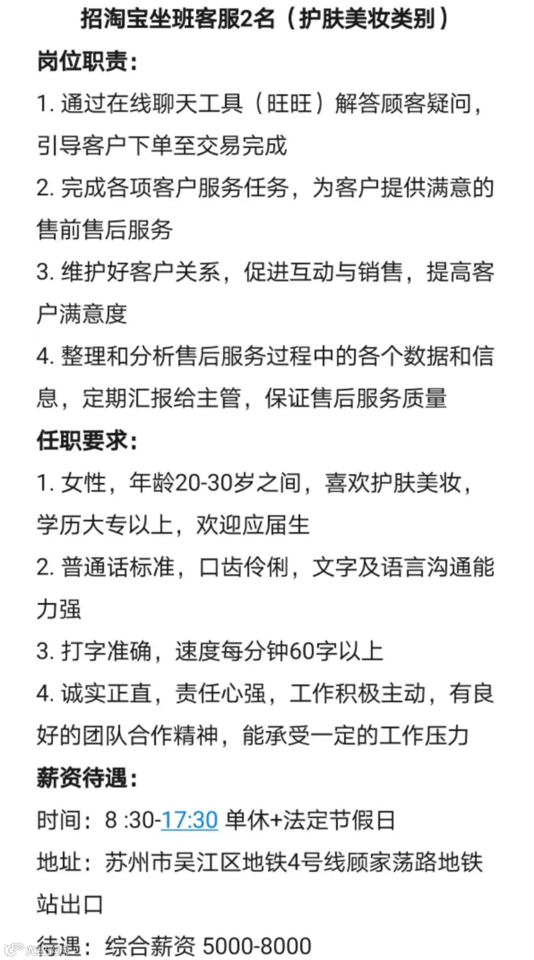 招淘宝客服(护肤美妆类)📱13390863273 (请微信联系jli139,电话不接)