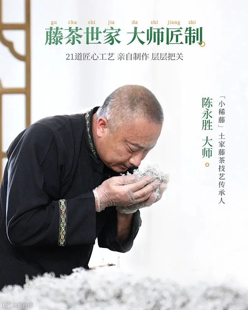 土家藤茶第七代技艺传承人陈永胜大师,保留着最完整的土家藤茶制作工艺。21道工艺每一个环节,亲自制作,层层把关。