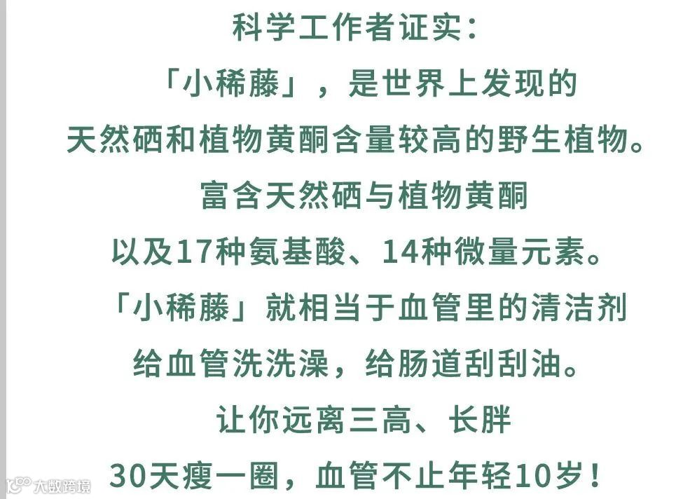 经权威机构成分对比检测显示,「小稀藤」总黄酮含量是银杏叶的110倍,蜂胶的45倍,绞股蓝的15倍。素有“植物黄酮大王”之称。
