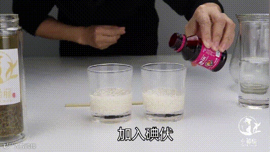 被碘伏氧化已变成黑色的大米,加入清水后无变化,加入