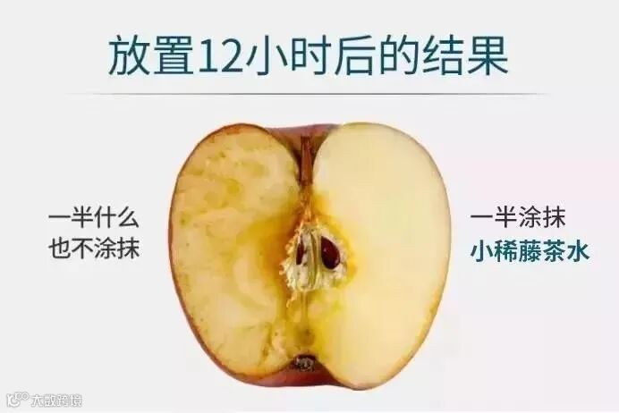 切开的苹果一边抹上小稀藤茶水,12小时后仍然新鲜如初,而未处理的另一边已经变成褐色(被氧化)。