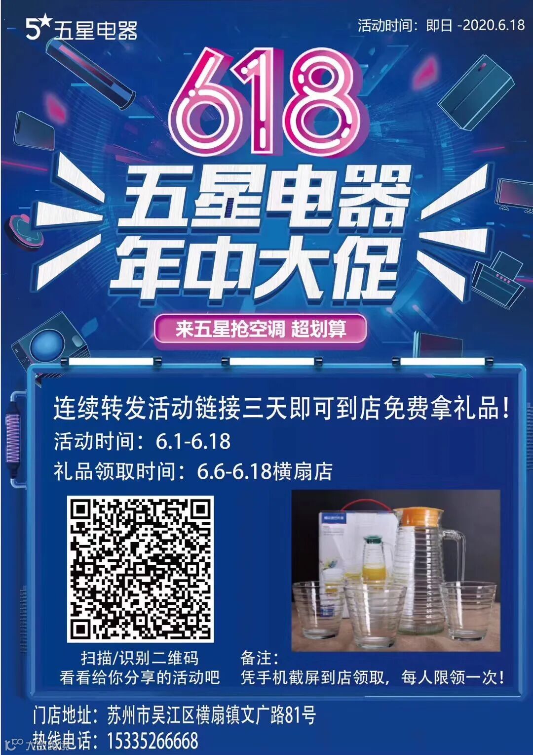 📣五星电器横扇店618年中大促开始啦!识别二维码,加店长好友,转发朋友圈三天即可到店领取冷水壶套装一套!店长电话15335266668 .