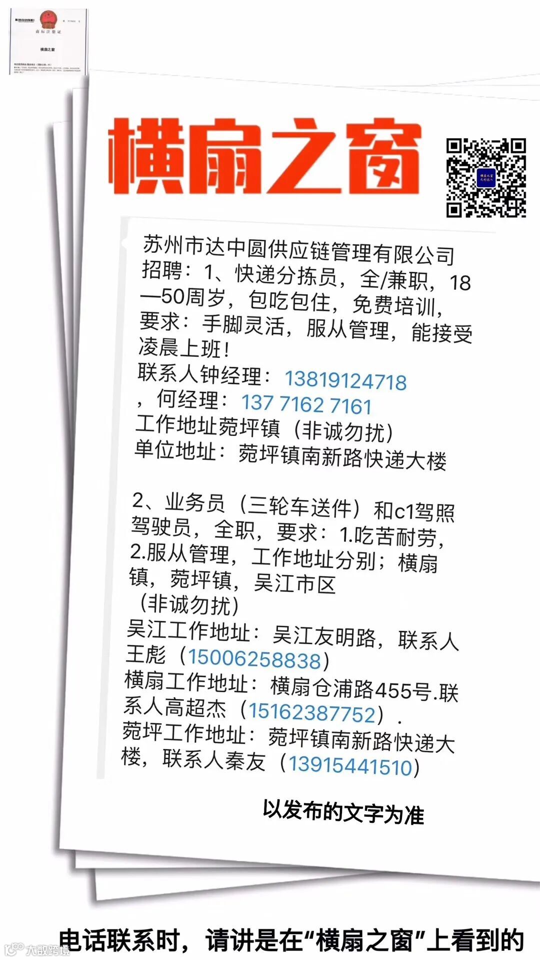 3⃣️横机翻机机修工1名,月薪面议!地址:横扇镇南举路雅阁宾馆对面📱15262365885微信同号