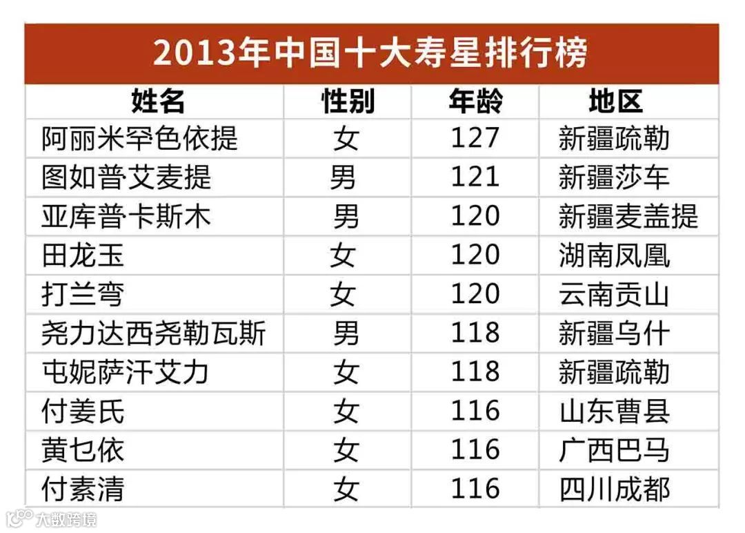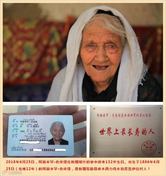而新疆,并不只有阿丽米罕一個長寿老人,更是著名的長寿之鄉。當年的十大寿星中有一半都來自新疆!當地有首歌词是這樣寫的:70歲的老漢健步如飛,80歲的老妈烹羊烤馕,90歲的夫妻成双成對……。在新疆有這樣的真实场景:120歲的婆婆坐在門前,等100歲的兒媳婦从娘家回來,80歲的孫女一面穿针引线,一面自豪地說:我還年轻……。