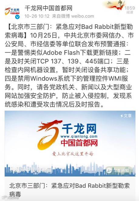 新勒索病毒名为“坏兔子”,采用加密系统防止网络安全专家破解恶意代码,与6月底爆发的“NotPetya”病毒有相似的传播方式。