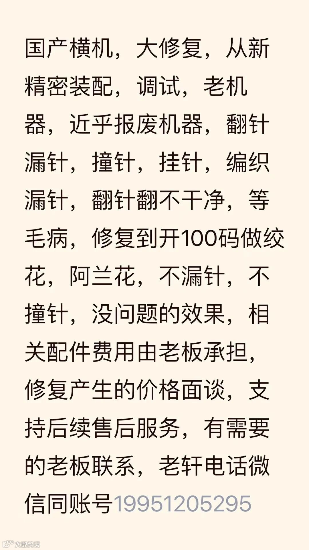 本人有2017年七台七针慈星横机出售,想加机器的老板联系我;还有气泵、倒毛机出售,价格面议,二手商勿扰,☎18936992581 庙港。
