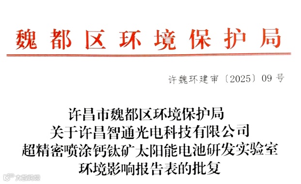 8月28日,河南省许昌市魏都区环境保护局发布《关于2025年8月28日作出的建设项目环境影响评价文件审批决定的公告》,正式批准许昌智通光电科技有限公司建设“超精密喷涂钙钛矿太阳能电池研发实验室”项目,公示期为8月28日至9月5日。