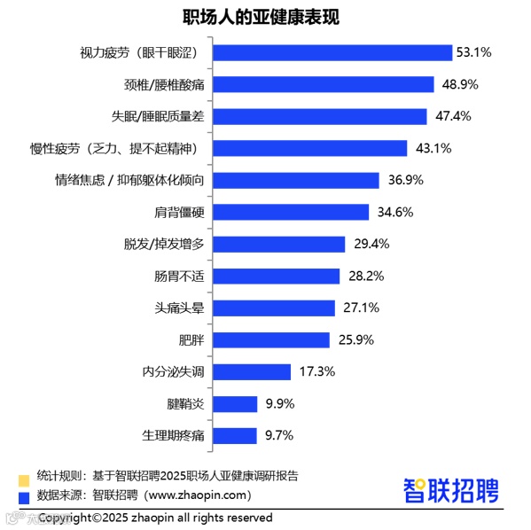 为深入了解职场人群的亚健康现状,智联招聘开展问卷调研,回收1805份有效样本,发布《2025职场人亚健康情况调研报告》,揭示当前职场健康隐患,并呼吁个人与企业共同关注健康管理,构建可持续发展的职场生态。