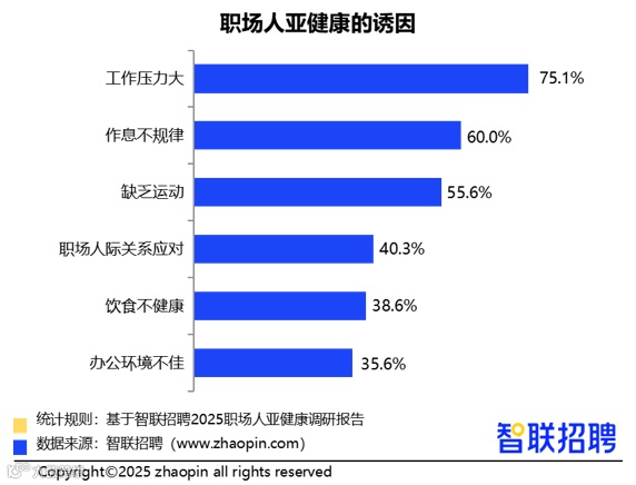 调查表明,75.1%的职场人将“工作压力大”列为首要原因,紧随其后的是作息不规律(60%)和缺乏运动(55.6%)。高强度工作任务、频繁加班、精神紧绷等因素叠加,使得身体长期处于应激状态,加速亚健康形成。