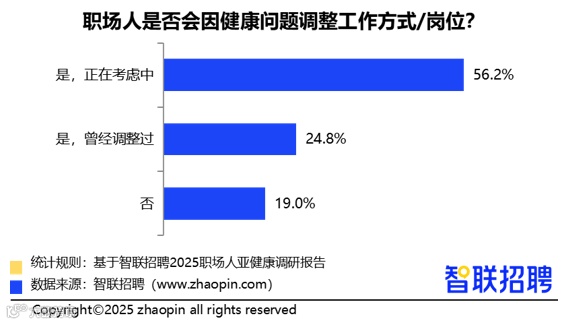 高达81%的职场人因亚健康产生转岗或改变工作方式的想法,其中56.2%正在犹豫,24.8%已采取行动。然而,58.8%反映公司健康福利缺失,仅34.3%享有年度体检等基础保障,企业健康支持体系亟需完善。