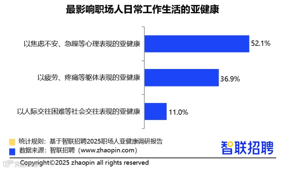 心理层面的影响尤为突出,52.1%的职场人曾经历焦虑、急躁等情绪波动,高于身体疲劳(36.9%)和人际困扰(11%),已成为影响工作效率与生活质量的主要因素。