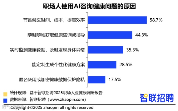 近三成职场人开始利用AI工具进行健康咨询和智能问诊。主要原因包括:58.7%认为其高效且节省成本,44.3%看重随时获取信息的便利性,35.3%认可其实时健康监测功能,有助于早期发现异常。
