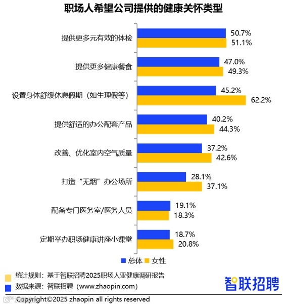 50.7%希望企业提供深度多元体检服务,47%期待供应更多健康餐食。女性员工尤为关注个性化关怀,62.2%希望在生理期获得舒缓休息假期。