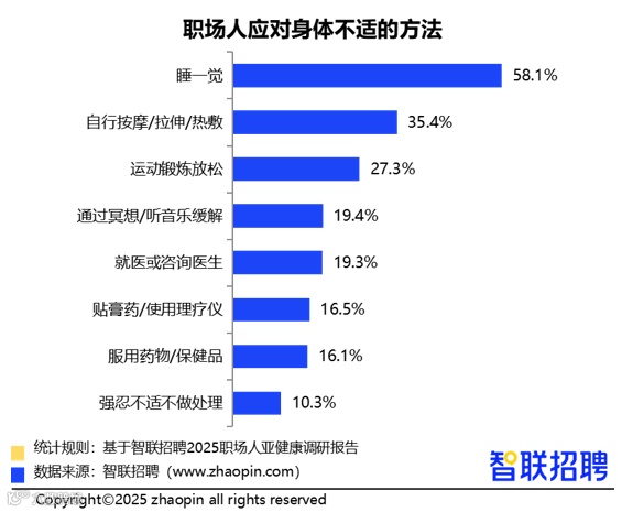 面对身体不适,58.1%的职场人选择通过睡眠恢复状态,认为休息即可缓解症状;35.4%会尝试拉伸、按摩或热敷;仅19.3%及时就医,10.3%选择忍耐。这反映出多数人尚未建立科学的健康管理意识。