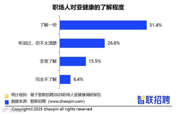 随着健康意识提升,职场人群对亚健康的认知不断增强。调研显示,66.9%的职场人表示了解亚健康,其中15.5%非常了解;26.6%虽不清楚具体定义但有所耳闻;仅6.4%完全不了解。