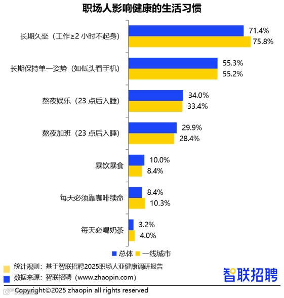 全国范围内,71.4%的职场人连续久坐超过2小时,一线城市比例高达75.8%。此外,55.3%长时间保持同一姿势,34%习惯晚于23点休息,不良生活习惯正悄然侵蚀身体健康。