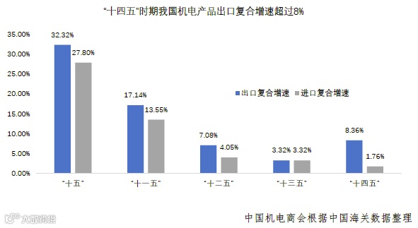 “十四五”期间,我国紧抓全球绿色化、数字化转型机遇,汽车、光伏、锂电池、集成电路、船舶等代表新质生产力的产品成为出口增长主力。机电产品出口年均复合增长率达8.36%,较“十三五”时期显著提速,为“十五五”发展奠定基础。