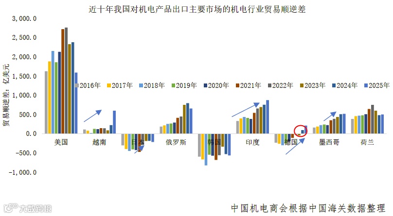 随着我国机电产业链日益完善,出口增量主要来自具备自主优势的行业,与德国、日本、韩国等传统强国在汽车、半导体、机械、锂电池等领域利益冲突加剧。2025年,我对德机电贸易顺差扩大至205.3亿美元(2024年为90.6亿),对欧盟顺差增至2057.4亿美元,同比增长16%,在汽车整车、零配件等领域已连续11个月以上保持顺差。