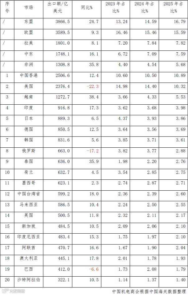 2025年,我国机电产品对非美市场出口达20646.9亿美元,同比增长13.5%。对欧盟、拉美地区出口保持平稳,占比基本稳定。