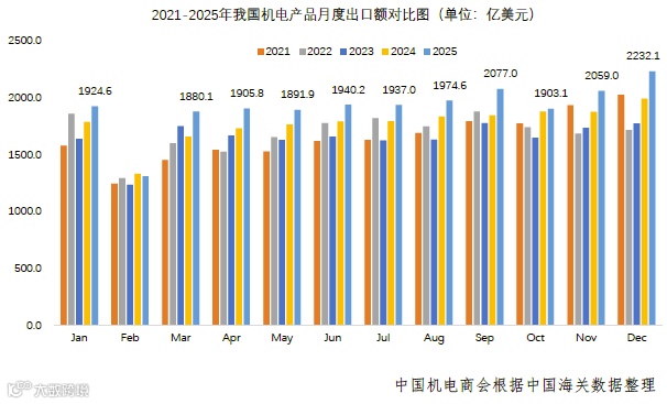 在产业配套完善、供应效率提升、新兴行业带动、市场多元化布局以及稳外贸政策落地等因素共同推动下,2025年我国机电产品出口实现超预期增长,总额创历史新高,占全商品出口比重升至61%,较2024年提升1.6个百分点。除2月受春节因素影响外,其余各月出口额均刷新同期纪录,12月出口达2232.1亿美元,为历史单月最高。第四季度出口同比增长7.8%,出口增速连续九个季度保持正增长,展现出行业扎实的基本面与强劲韧性。