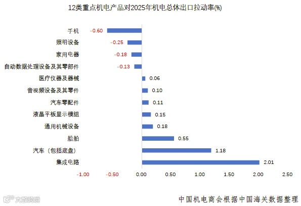 海关数据显示,集成电路、汽车整车、汽车零配件、通用机械设备、船舶、音视频设备及零件、液晶平板显示模组、医疗仪器及器械等8类机电产品出口实现增长。其中,汽车、集成电路、船舶等高附加值行业出口比重上升,合计拉动机电出口增幅3.7个百分点。
