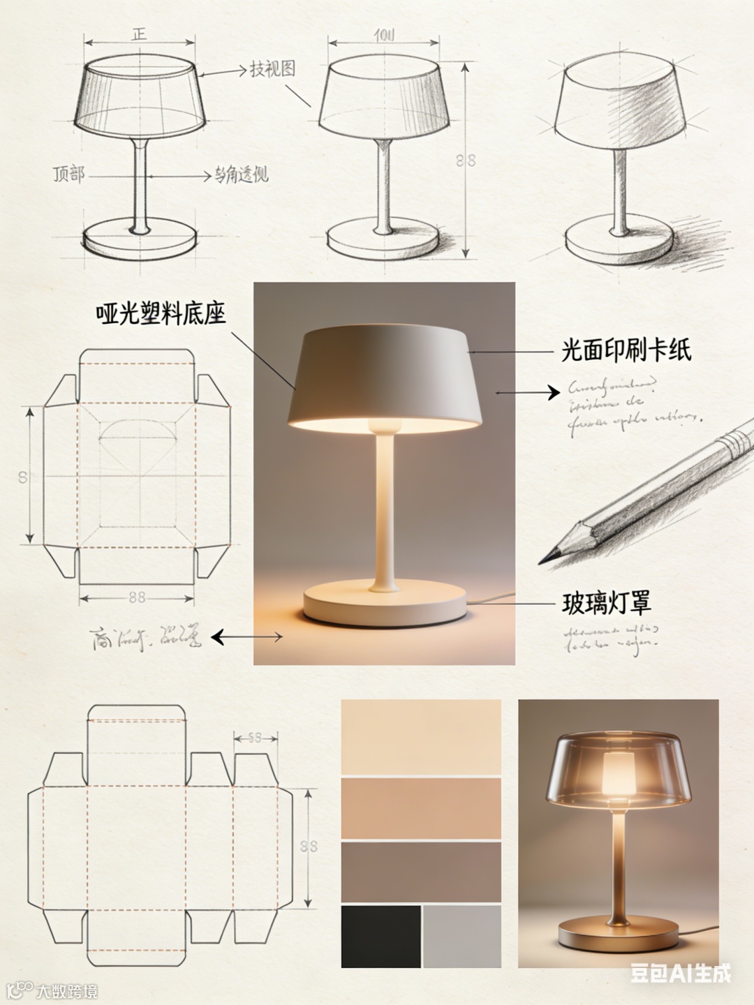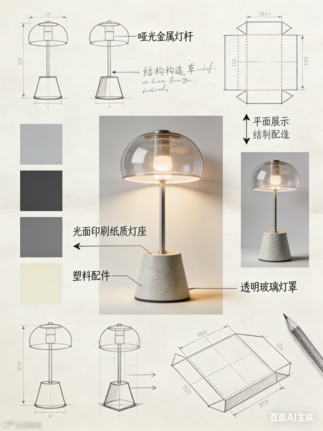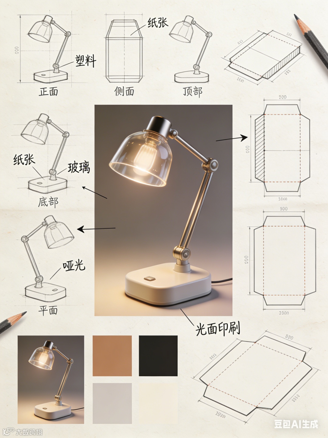 创建台灯产品包装用的工业设计插图板:中央为3D渲染主图,材质真实,灯光柔和,具商业成品质感;周围布局技术视图(正、侧、顶、底、透视及展开图),含构造草图、折痕线、接缝细节与毫米级尺寸标注;手写注释标明材料类型(哑光/光面印刷、塑料、纸张、玻璃等),搭配色板、实物插图与柔阴影;背景模拟素描纸,融合渲染图与铅笔草图,体现现代工业美学与高精度细节,适用于作品集展示。