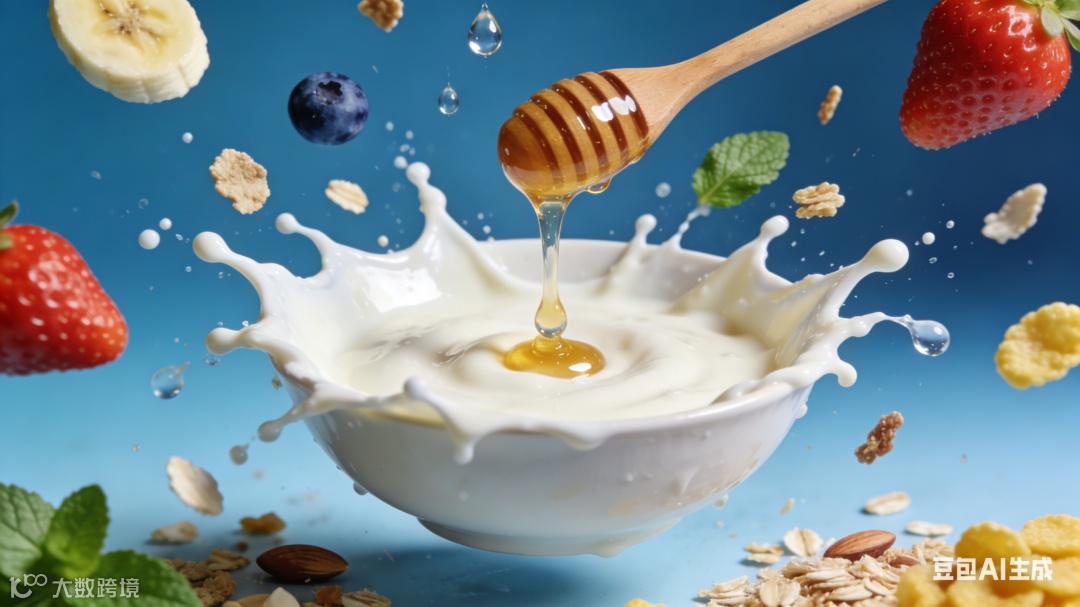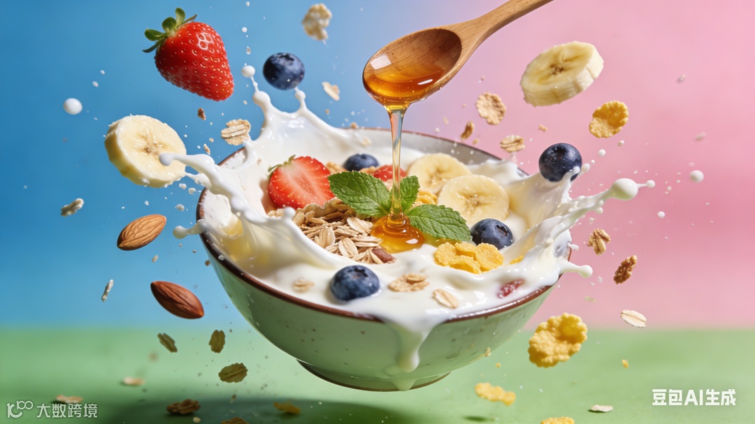 超写实高速美食摄影:碗体悬空,内容物向外爆发飞溅。浓稠酸奶或奶昔基底伴随水果、浆果、香蕉片、麦片、坚果、香草等剧烈喷射,蜂蜜自木勺滴落瞬间凝固。画面极致锐利,色彩鲜艳,质感光泽,背景为纯色(蓝/粉/绿),结合微距镜头与浅景深,布光精准,展现电影级构图与8K超写实细节,契合商业广告需求。
