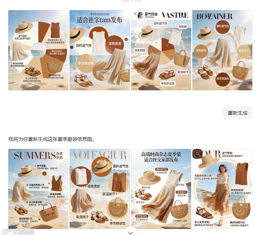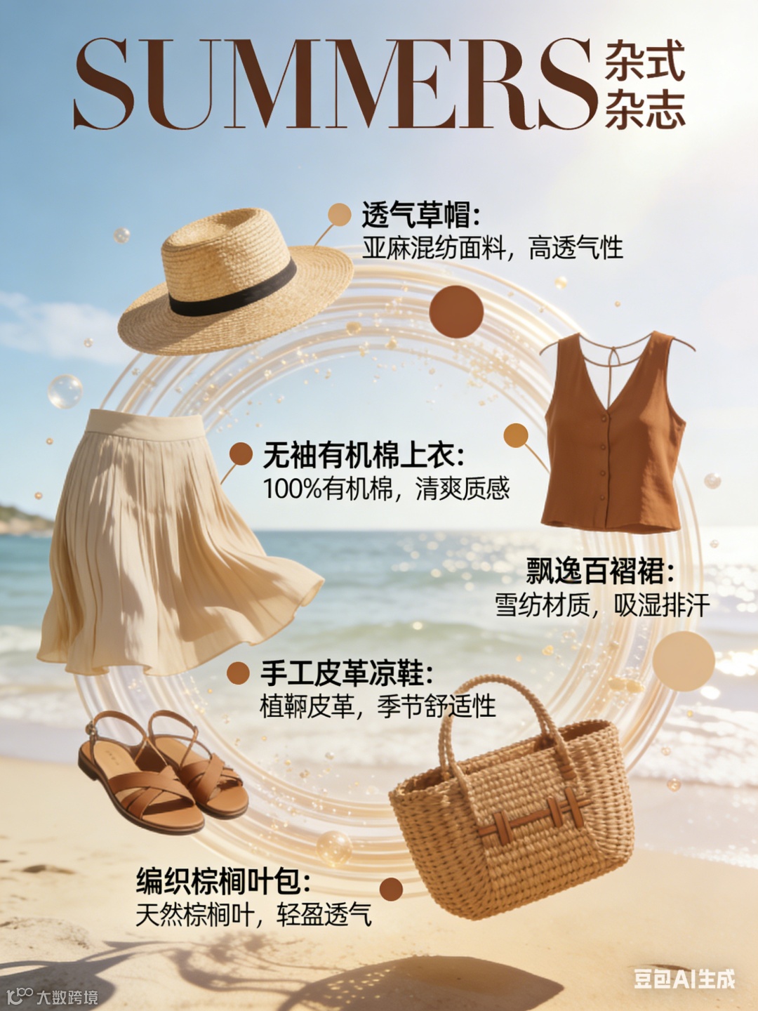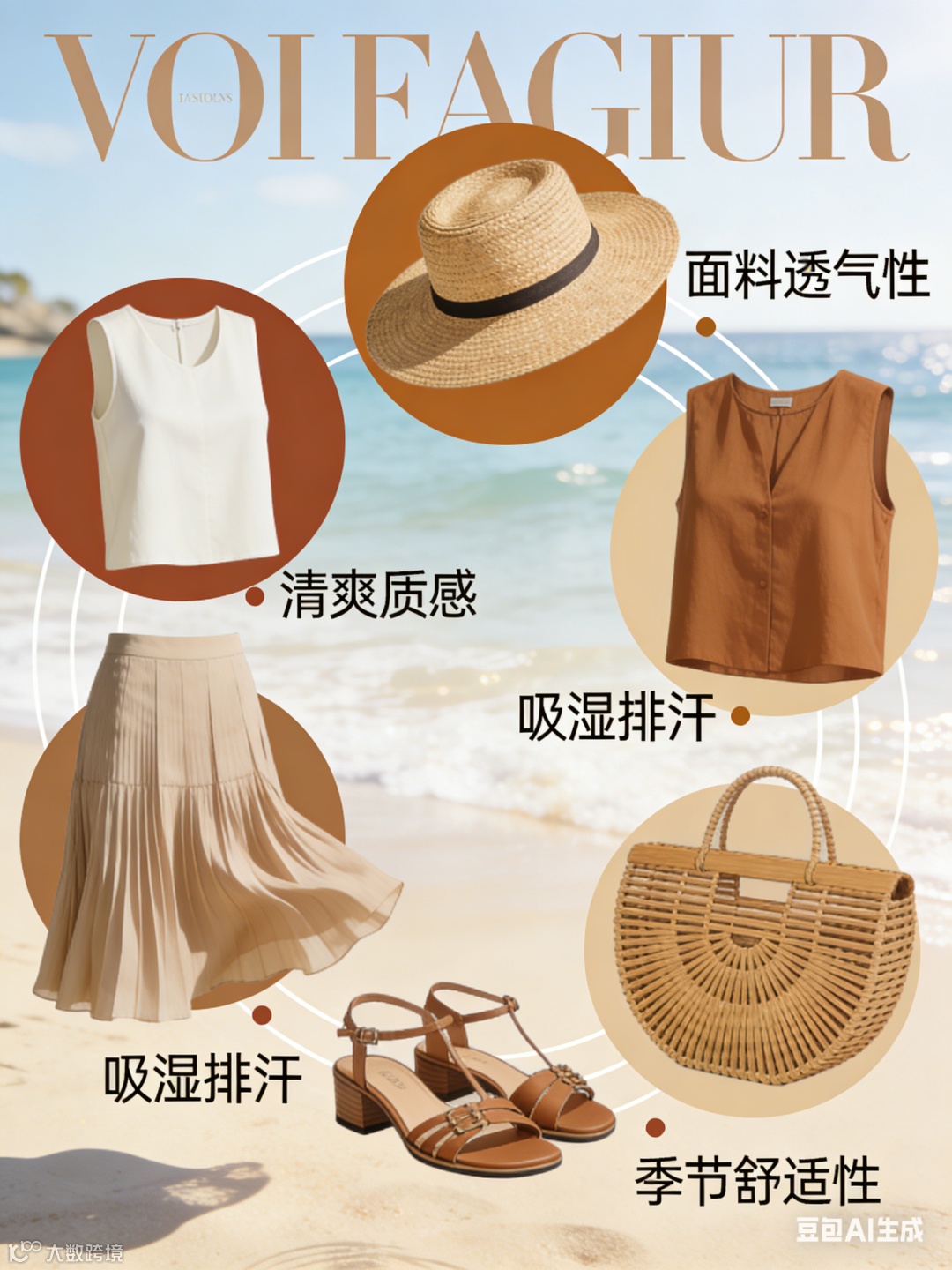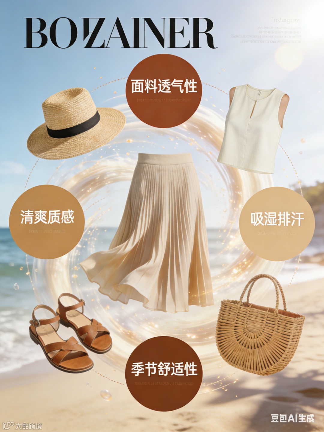 高端时尚夏季服装信息图,采用漂浮元素以圆形爆炸式构图排列,包含草帽、有机棉无袖上衣、百褶裙、皮革凉鞋与棕榈叶编织包;通过标注突出面料透气性、吸湿排汗与舒适特性;整体色调为象牙白、赤陶色、沙色与棕褐等温暖中性色;加入轻盈运动轨迹与布料旋涡表现夏日微风,自然阳光营造柔和阴影与光泽;风格兼具地中海生活方式氛围与奢华杂志美学,适合Instagram传播。