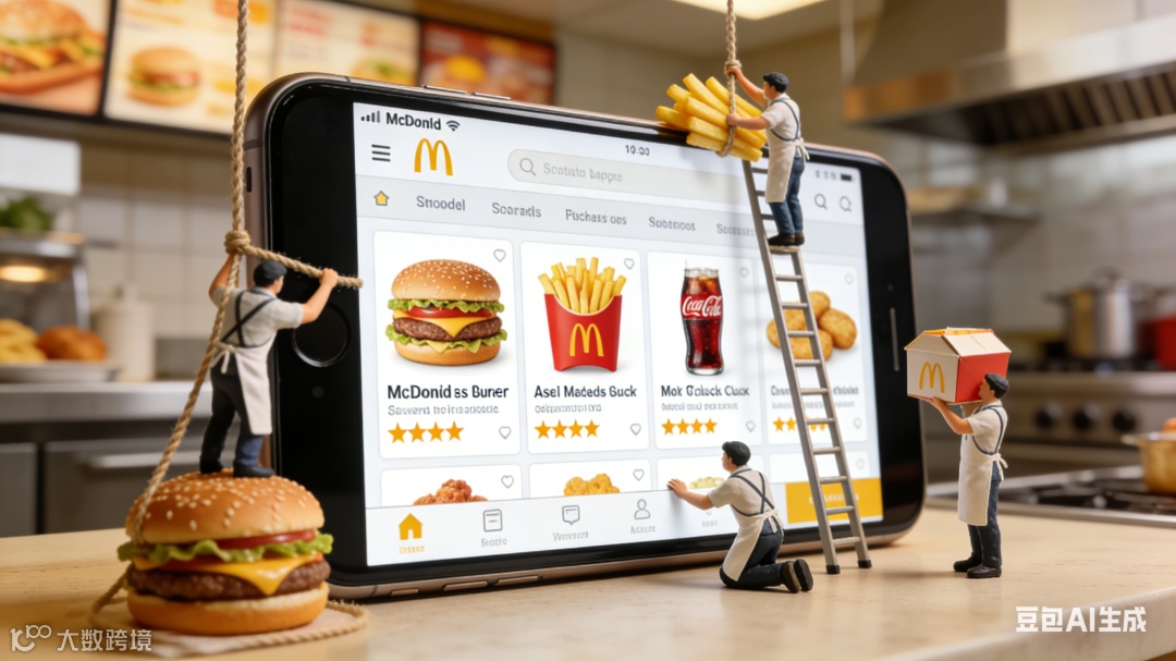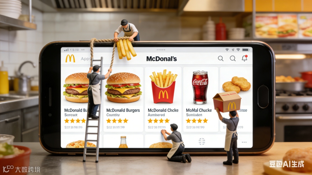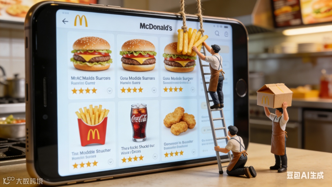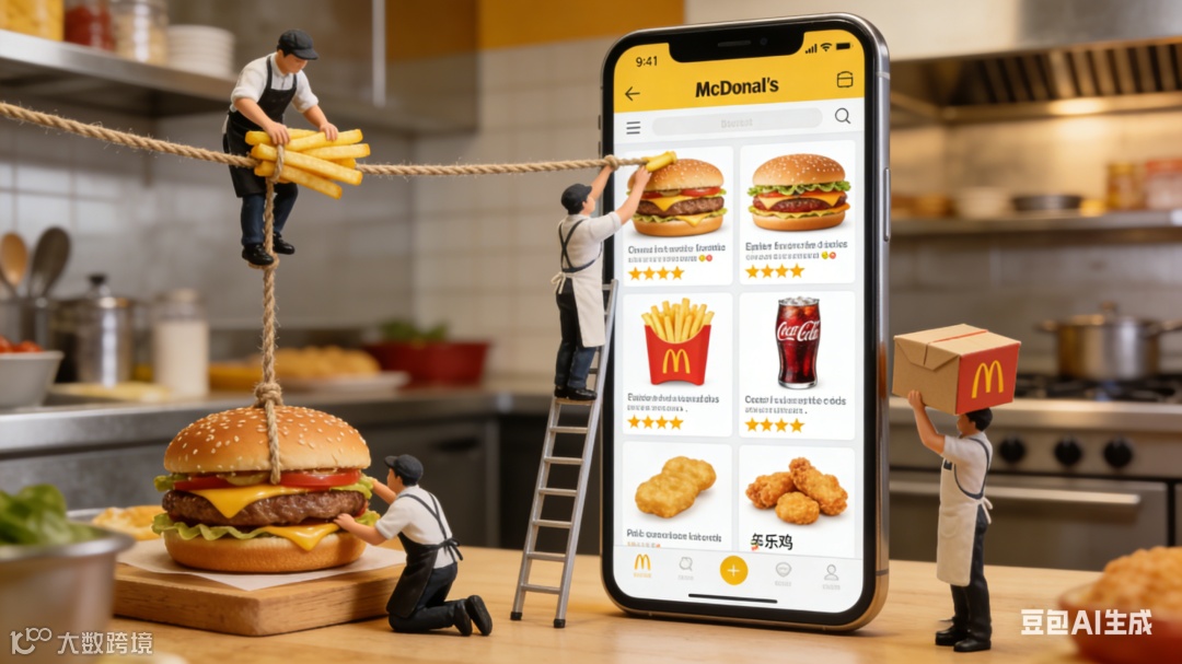 超写实创意广告场景:一台巨型智能手机置于现代餐厅厨房中,屏幕显示麦当劳订餐界面,食物如自动售货机般排列整齐——巨无霸、薯条、可乐、麦乐鸡等清晰可见评分与评论。迷你员工与设备互动:有人攀绳放置薯条,有人用梯子调整汉堡位置,有人检查界面,有人举起外卖箱。画面突出比例反差、精细纹理、逼真光泽、电影级灯光与浅景深,风格为高端商业摄影,色调温暖,高度写实且富有想象力。