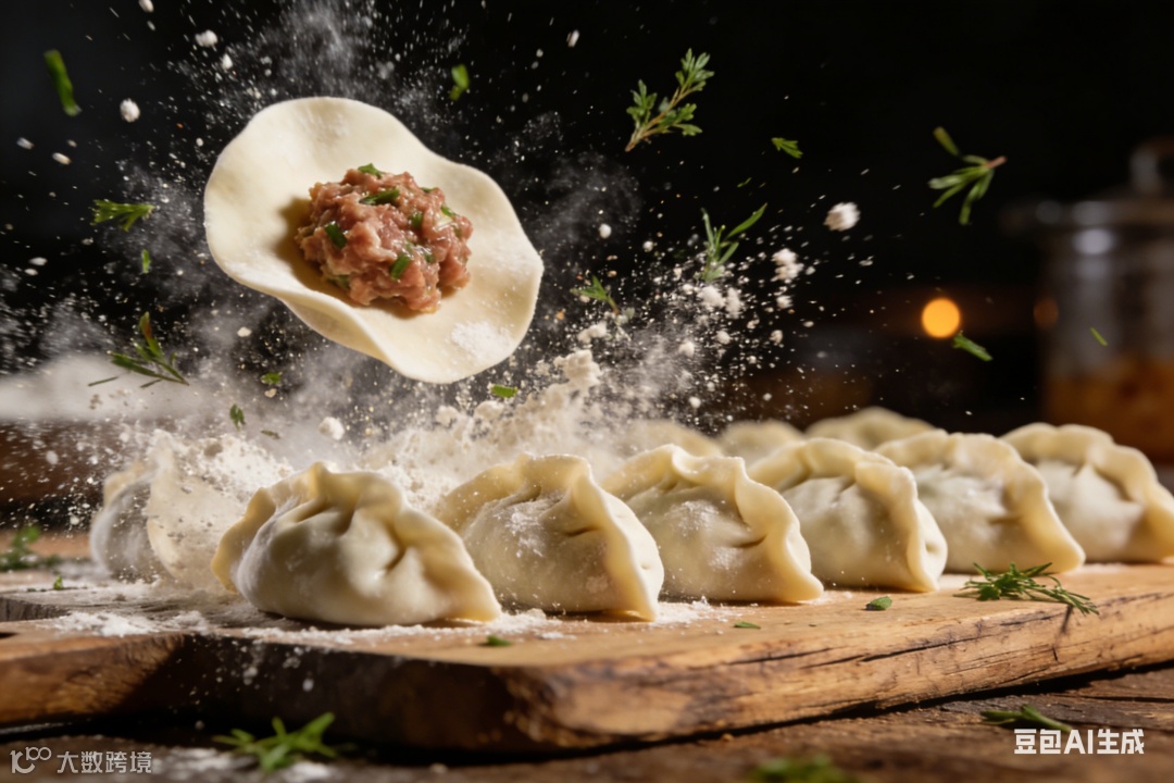 超真实电影感美食摄影:新鲜蒸饺置于质朴木板上,面皮光泽、褶纹精致,热气升腾;另一视角为爆炸分解图——饺子皮与肉馅悬浮空中,面粉颗粒动态定格,香草散落,呈现慢动作戏剧效果。采用温暖氛围光、浅景深、深色背景,强调专业美食造型、超细节纹理与8K微距摄影质感。
