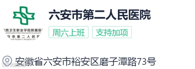 医院地址:安徽六安市裕安区磨子潭路73号六安市第二人民医院仁济楼二层