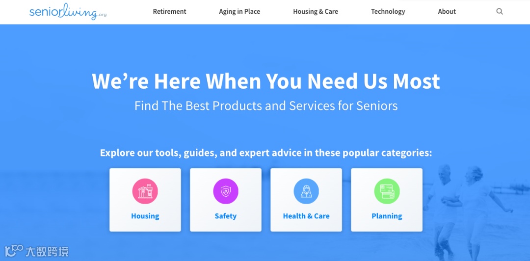 平台内容分为四大板块:退休生活(Retirement)、居家养老(Aging in Place)、住房与护理(Housing & Care)、技术应用(Technology)。