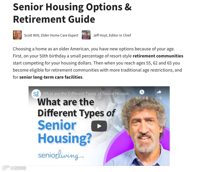 养老机构是长者最关心的核心议题之一。Senior Living通过视频导览帮助用户快速了解不同类型养老机构的区别,并引导用户根据自身需求深入阅读。