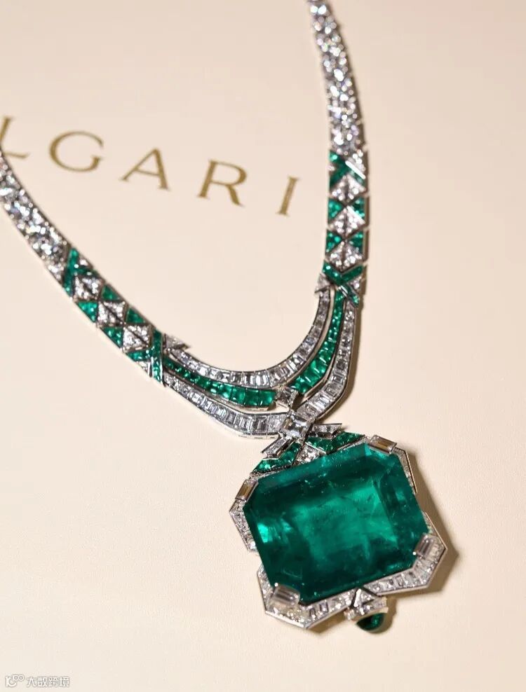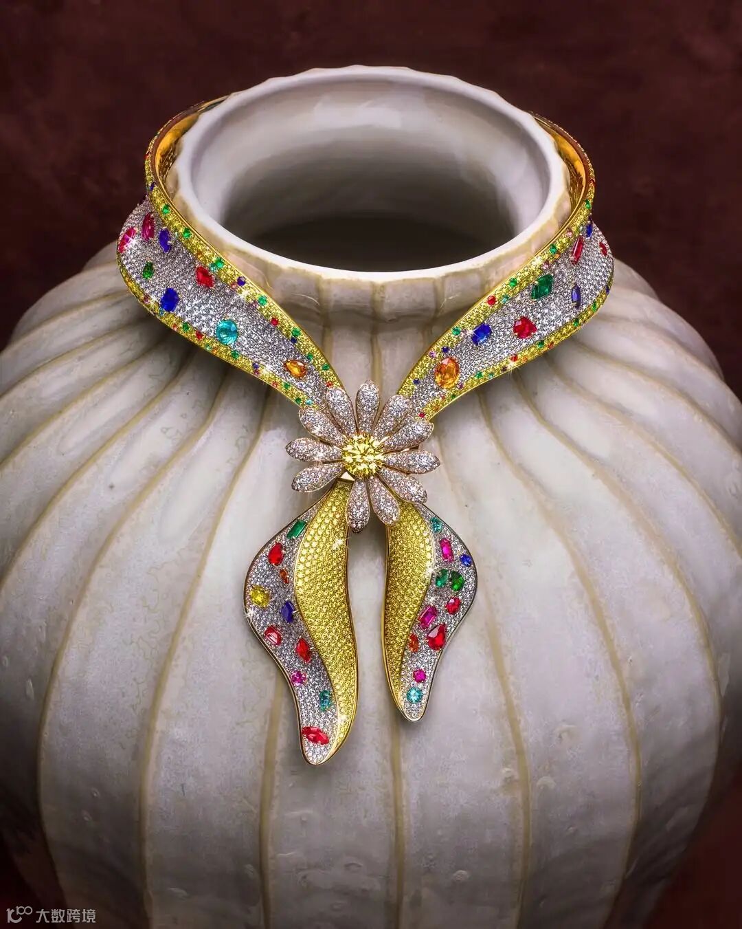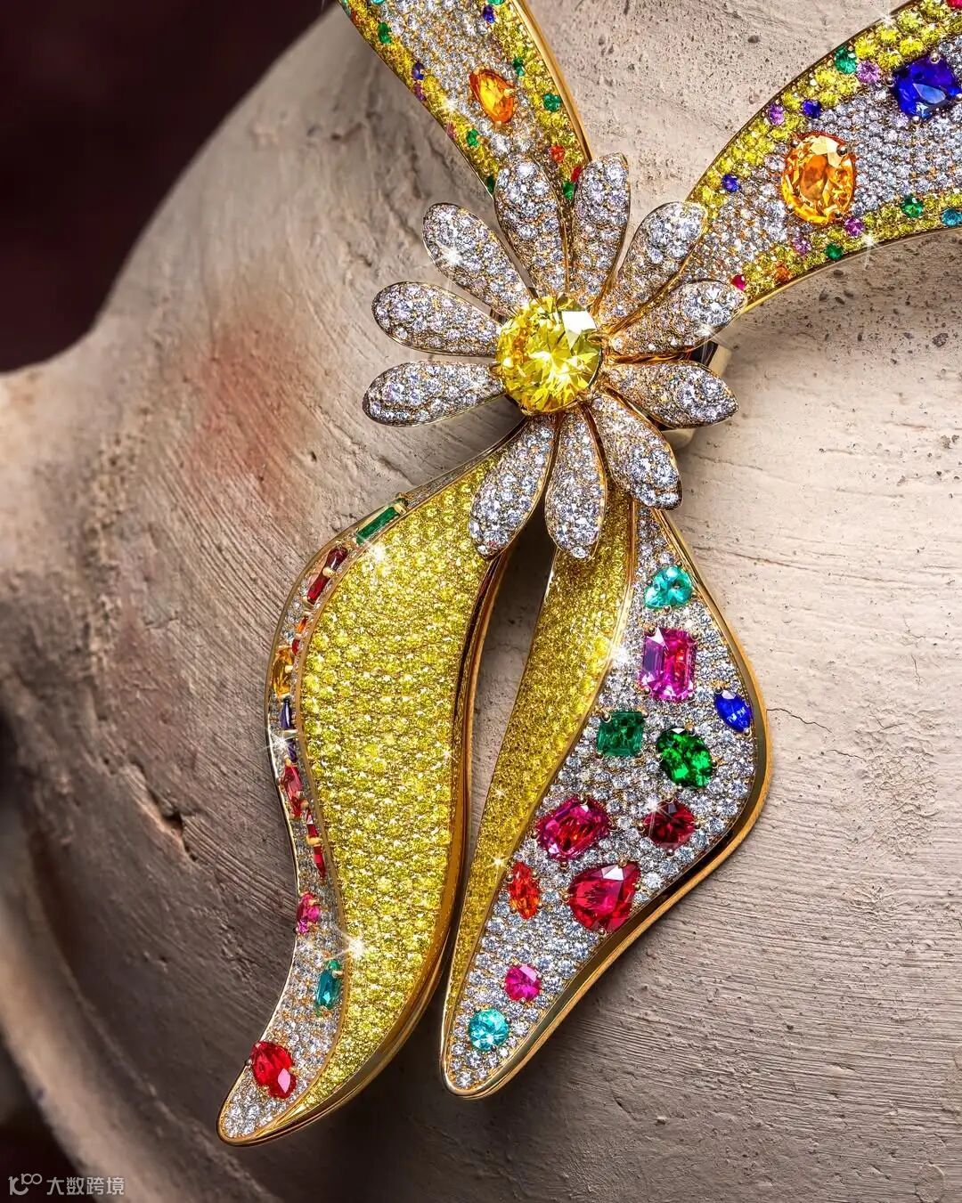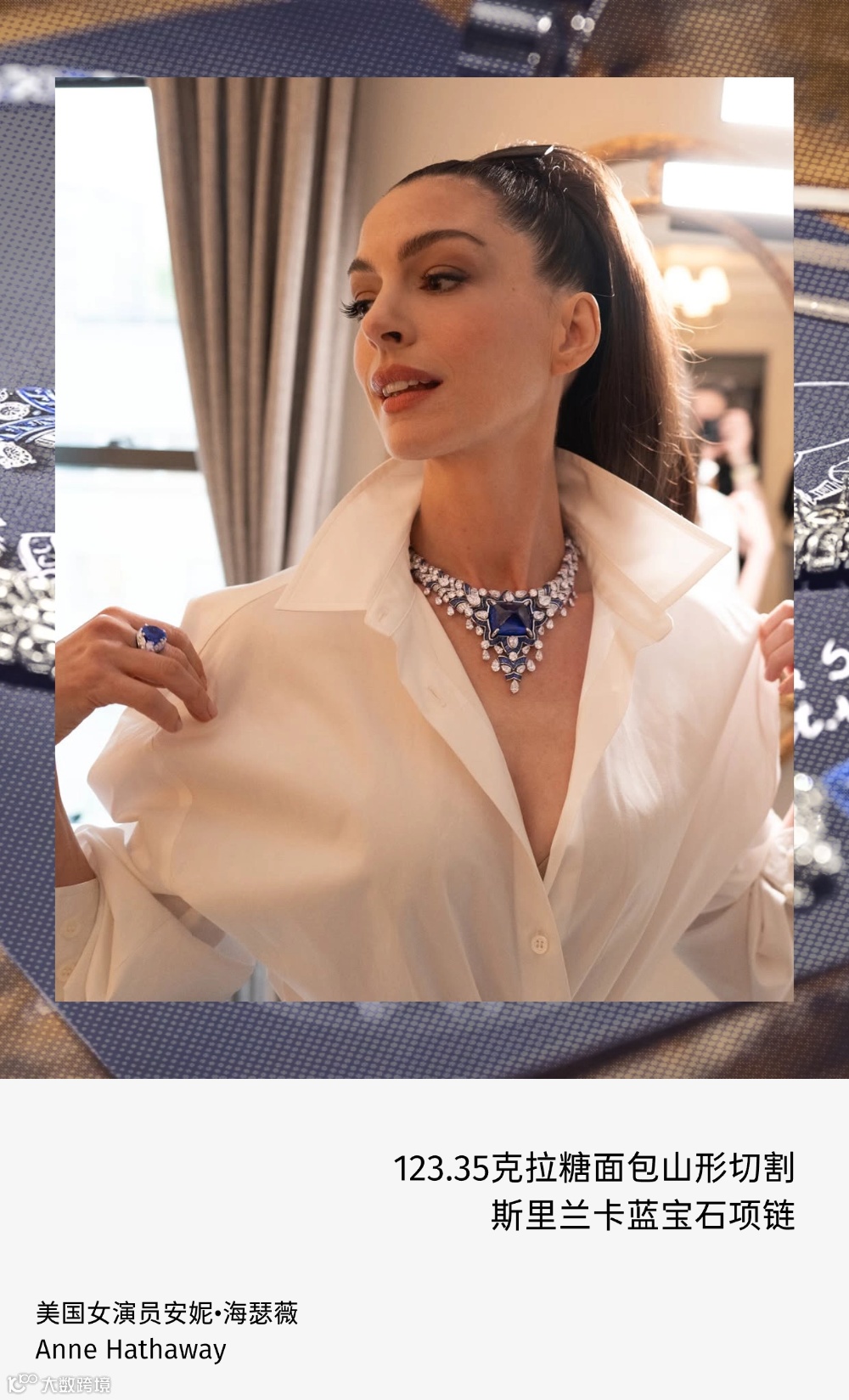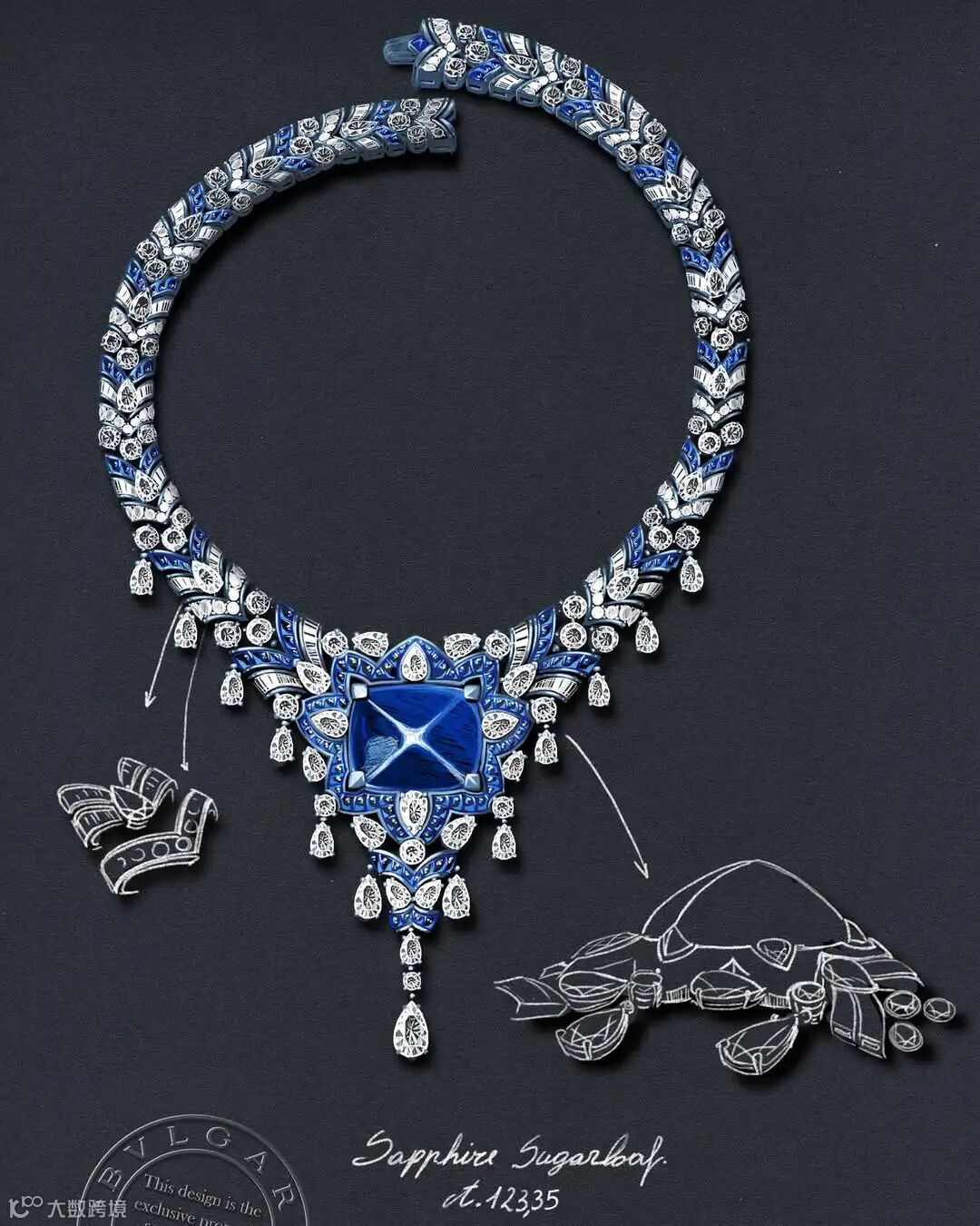 整条项链耗时1500多个小时精心锻造而成,蓝宝石作为主石象征着标志性的罗马穹顶。除此之外,项链上还镶嵌着331颗定制切割的蓝宝石和梨形钻石,所有宝石和谐交融,共同构成了一幅蓝色星空与罗马宏伟建筑交相辉映的画卷。
