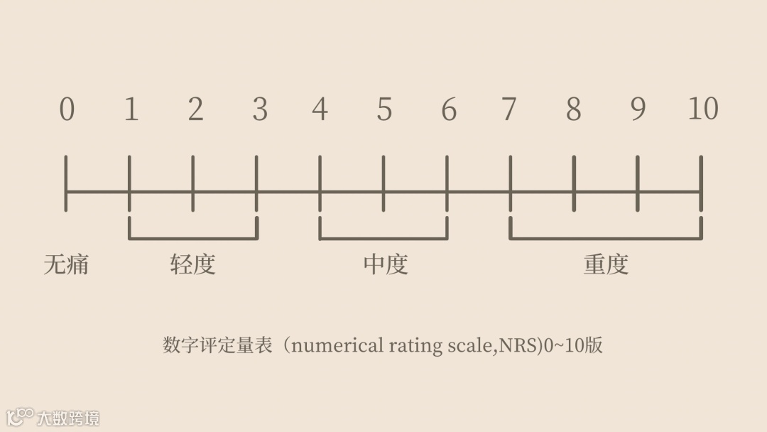 数字评定量表(Numerical Rating Scale, NRS)是单维度疼痛量表之一,由0~10这11个数字组成,以逐级递增的方式描述疼痛程度。