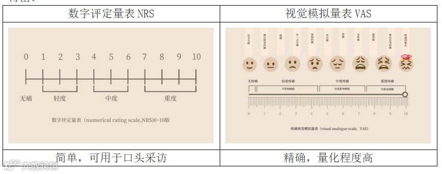 需要注意的是,数字评定量表NRS与视觉模拟量表VAS较为相似,但有本质上的区别,数字评定量表NRS是通过在0~10这11个数字之间进行选择,其结果以数字划分;而视觉模拟量表VAS是在一条长为100mm的线段上进行标记,其结果通过测量刻度得出。