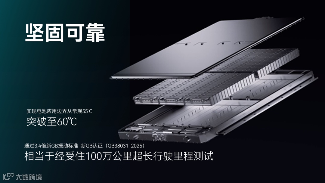巧克力换电块结构坚固,历经严苛测试,振动耐久标准达到国家新规的3.4倍(GB38031-2025),相当于经受住100万公里超长里程考验。电芯层面,宁德时代首创耐高温电芯,配合独家热管理技术,实现电池应用边界从常规55℃突破至60℃,高温环境下更稳定、更可靠。背后是材料、电解液、结构设计等全方位的技术突破。