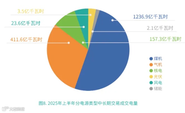 按电源类型划分:煤电机组交易电量1236.9亿千瓦时,气电411.6亿千瓦时,核电157.3亿千瓦时,光伏3.5亿千瓦时,风电23.6亿千瓦时,储能2.1亿千瓦时。