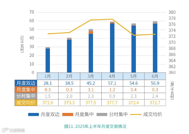 1-6月,月度交易累计成交电量297.4亿千瓦时,成交均价374.6厘/千瓦时。具体如下: