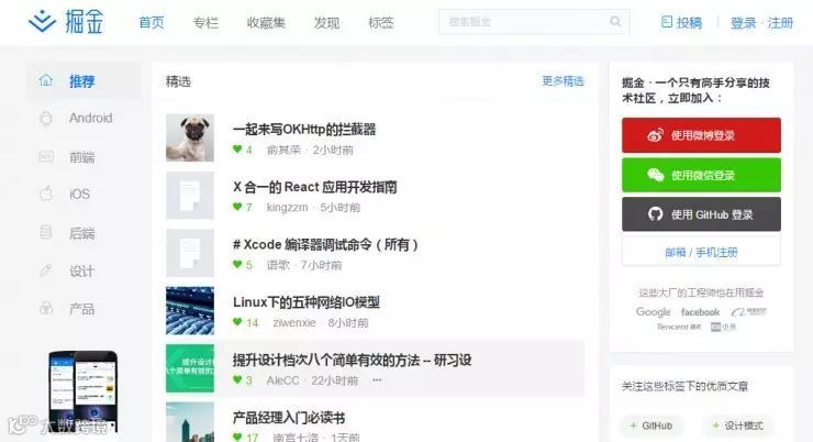 阴明:是的,在技术上面我们也非常在意数据推荐,但从目的上不完全一样。今日头条是杀时间的,掘金的目标是减时间的,我们解决的是效率问题,今日头条希望你疯狂地缠在这里,我们依赖的不只是你一天停留多久,一个人在掘金上一天停留半个小时也挺可怕的,如果以现在的产品模式,日停留是20分钟。