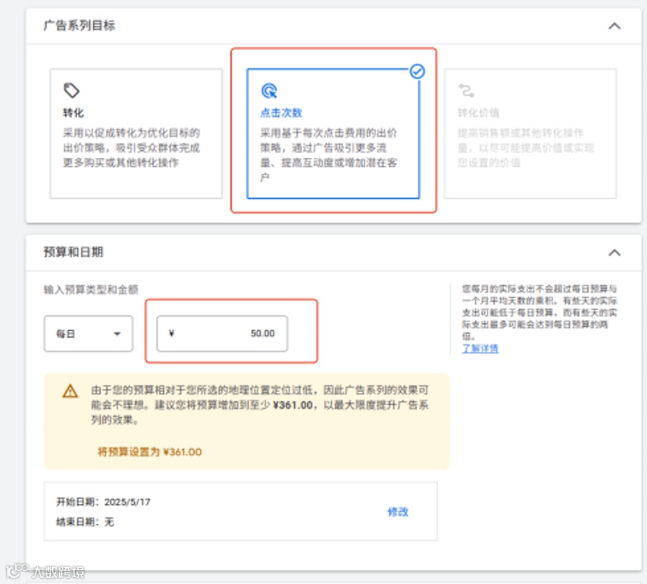 填写广告系列名称,建议使用“产品+地区+语言+日期”格式。选择“点击次数”为目标,设定每日预算,投放设备通常只选计算机和手机。