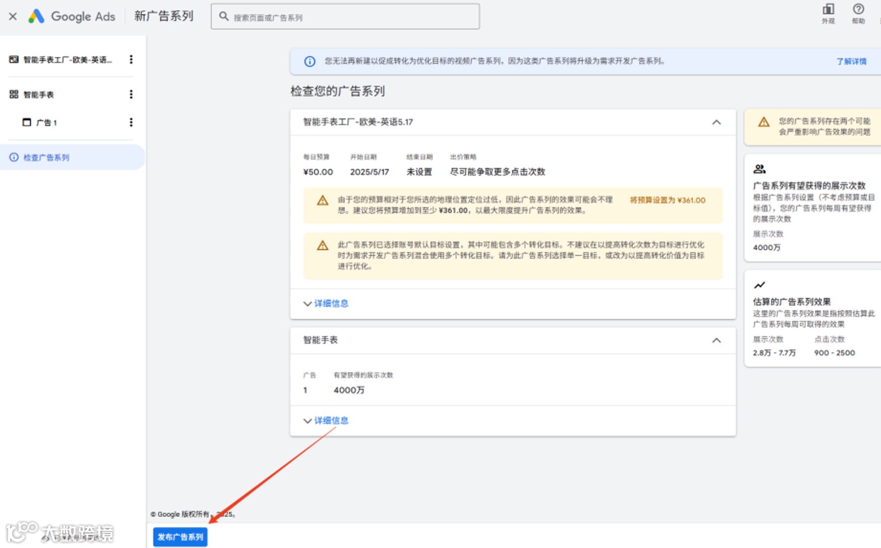 上传徽标(网站Logo或图标),确认最终到达网址。前往检查页面核对信息,无误后点击“发布广告系列”,等待审核即可。